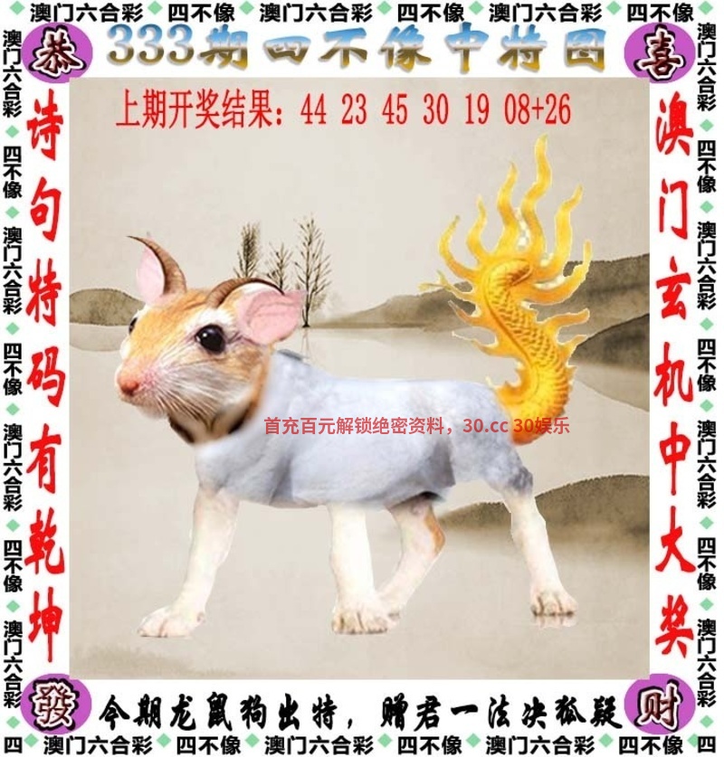 | 332期五肖 | 虎羊鼠龙鸡 | 开:龙26 |